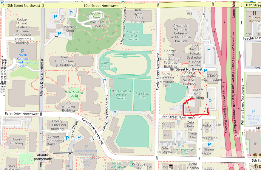 Visitor parking is available behind the building (west side) as well as in the parking lot in front (east side). The O'Keefe building is circled. Walking directions are shown by the red line.