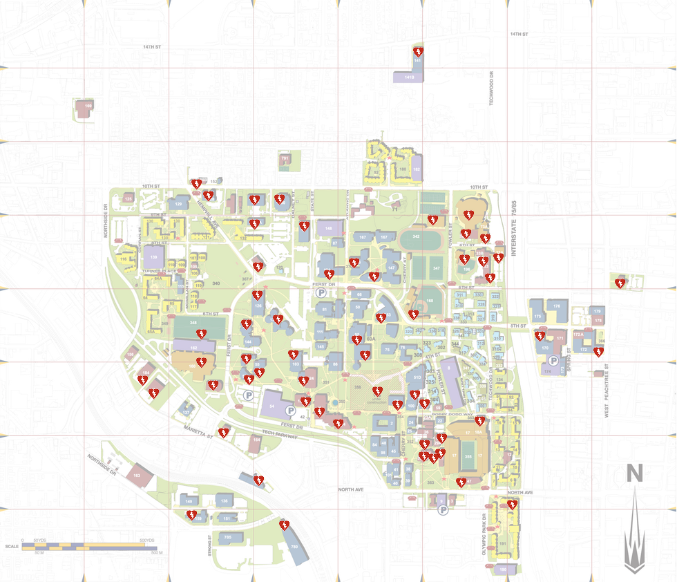 An Automated External Defibrillator (AED) is a portable automatic medical device used to restore normal heart rhythm to patients in cardiac arrest. Sudden Cardiac Arrest is unpredictable, but is potentially a fatal event. A person’s chance of survival can be increased by establishing a “chain of survival” system that includes early recognition, early access by trained emergency medical services (EMS), early cardiopulmonary resuscitation (CPR), and early defibrillation. General Safety has developed a program to ensure the availability, maintenance, and proper use of the AEDs which are located throughout the Georgia Tech campus.